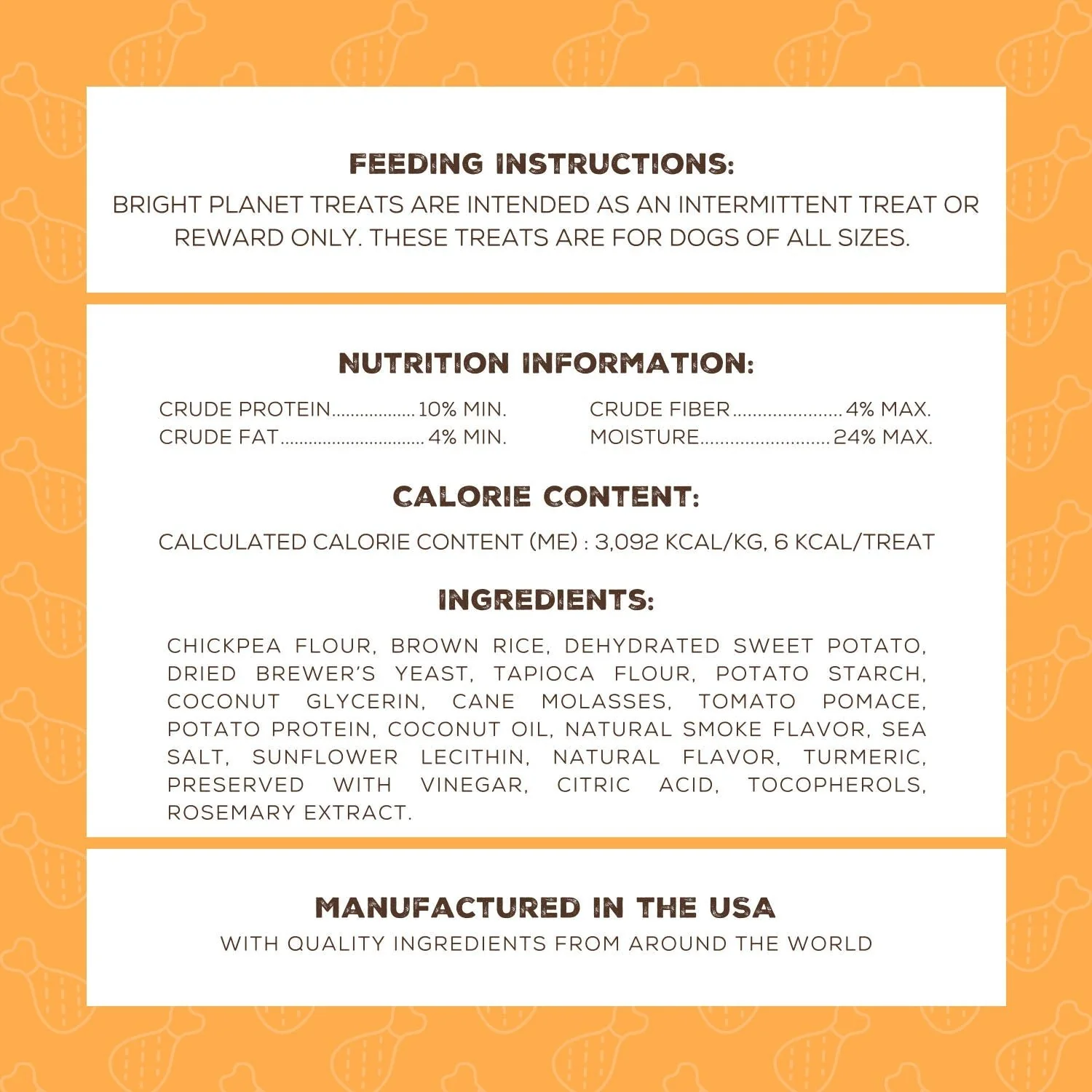 The treat is a chicken drummy shape and is 1" long and is approximately 0.25" thick. At only 6 calories per treat, you can really spoil your dog! Break it in half for training sessions or give a full treat when your special doggo has been extra good.