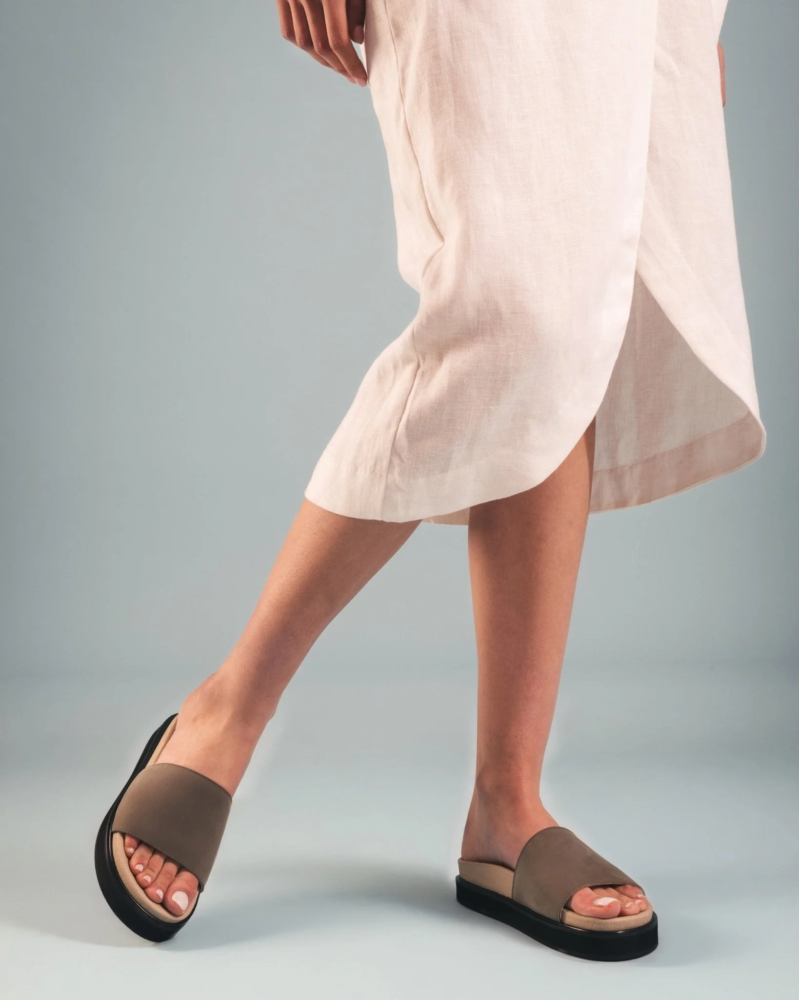 Okina Green vegan sandals are handcrafted in Portugal with eco-friendly microfibers in a bold green finish. Featuring a 2 cm platform, a wide 8 cm strap at the front, and a 1 cm sole, these slip-ons blend comfort with contemporary style. Perfect for modern, sustainable wardrobes seeking a vibrant, conscious choice.